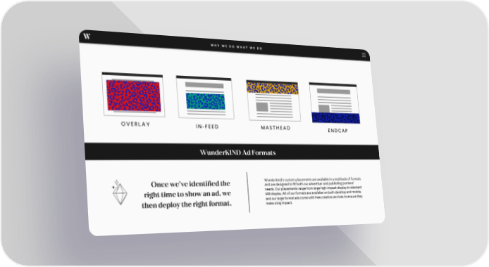 WHY WE DO WHAT WE DO OVERLAY IN-FEED MASTHEAD ENDCAP WunderKIND Ad Formats Once we’ve identified the Wunderkind’s custom placements are available in a multitude of formats and are designed to fit both our advertiser and publishing partners’ right time to show an ad, we needs. Our placements range from large high-impact display to standard IAB display. All of our formats are available on both desktop and mobile, then deploy the right format. and our large format ads come with free creative services to ensure they make a big impact.