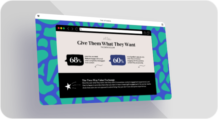 THE STAKES Give Them What They Want THE DATA IS CLEAR state they are most would preferto seeads only likely to engage with an ad when they’ve finished 68% when completely disengaged 60% engaging with the publisher from content content they are perusing The Two-Way Value Exchange Give the user what they want, how they want it (a seamless content engagement experience), and they’re happy to provide what what you want in return (meaningful engagement). Our survey results show that users are not opposed to advertising, they just don’t love disruptive experiences.