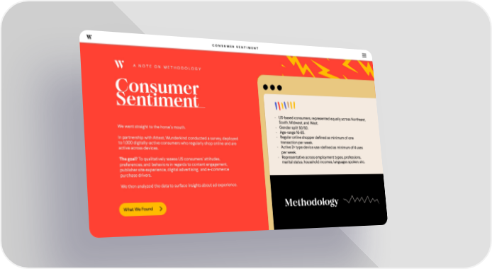 CONSUMER SENTIMENT A NOTE ON METHODOLOGY - US-based consumers, represented equally across Northeast, South, Midwest, and West. We went straight to the horse’s mouth. - Gender split 50/50. - Age-range 16-65. In partnership with Attest, Wunderkind conducted a survey, deployed - Regular online shopper defined as minimum of one to 1,000 digitally-active consumers who regularly shop online and are transaction per week. active across devices. - Active 2+ type device user defined as minimum of 4 uses per week. The goal?To qualitatively assess US consumers’ attitudes, - Representative across employment types, professions, preferences, and behaviors in regards to content engagement, marital status, household incomes, languages spoken, etc. publisher site experience, digital advertising, and e-commerce purchase drivers. We then analyzed the data to surface insights about ad experience. What We Found Methodology