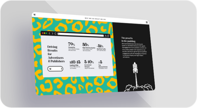 WHY WE DO WHAT WE DO The proof is in the pudding. We have established that placing ads 79% 38% based on identified behaviors that signify Driving Viewability HighAttention Quality +31% disengagement from publisher content not Over-Indexes to display Over-Indexes in lift to Qualified Traffic only create a better user experience, but Results 61% benchmark benchmark (24%) Lift in qualified traffic are also optimal for garnering true qualified engagement with ad messaging compared for to standard display and high-impact Advertisers activations. & Publishers $10-15 5-10% #5 Leading CPMs Incremental Top Gross CPMs driven by Demand Revenue Partner our inventory Avg. lift in ad revenue Consistently in top 5