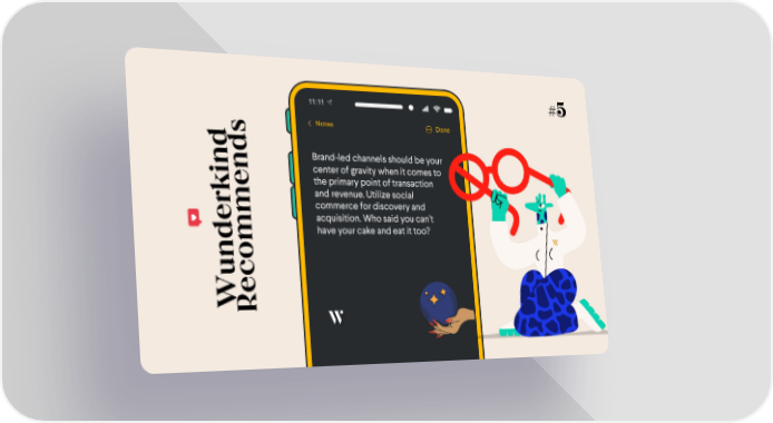11:11 #5 d s Notes Done n d Brand-led channels should be your i n center of gravity when it comes to k e the primary point of transaction r and revenue. Utilize social e m commerce for discovery and acquisition. Who said you can’t d have your cake and eat it too? n om Wu c Re