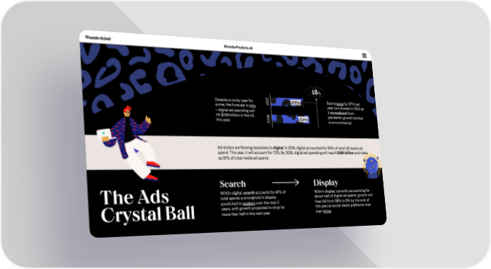 WunderPredicts #6 +13% 20 Despite a rocky year for 21 $220b Spend grewby 37% last some, the forecast is rosy year, but slowed in 2022 as –digital ad spending will it normalizedfrom hit $249 billion in the US 20 pandemic growth (similar this year. 23 $249b to e-commerce). Ad dollars are flowing resolutely to digital. In 2019, digital accounted for 56% of total US media ad spend. This year, it will account for 72%. By 2026, digital ad spending will reach$386 billion and make up 81% of total media ad spend. Search Display Within digital, search accounts for 41% of Within display, currently accounting for The Ads total spend, a stronghold in display about half of digital ad spend, growth will predicted to weakenover the next 2 free-fall from 38% to 9% by the end of years, with growth projected to drop by this year as social media platforms lose Crystal Ball more than half in the next year. their shine.