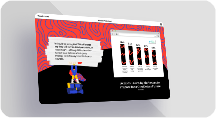 WunderPredicts #4 56% 54% It should be jarring that 75% of brands 52% 51% 49% say they still rely on third-party data, at least in part – although 68% claim they have at least defined a first-party strategy to shift away from third-party sources. providing creating a creating investing reducing information- first-party second-party in new internal data sharing data data-sharing technologies siloes incentives for strategy agreements customers Actions Taken by Marketers to Prepare for a Cookieless Future (Gartner)